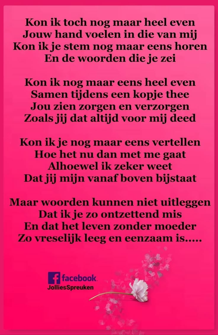 Moederdag kan een moeilijke dag zijn voor degenen die een geliefde moeder moeten missen. Het gemis van haar aanwezigheid kan extra voelbaar zijn op deze speciale dag vol viering en eerbetoon. Toch is het belangrijk om te onthouden dat de liefde die je koestert voor je moeder nooit verdwijnt, zelfs niet in haar afwezigheid. Haar geest leeft voort in de herinneringen, de lessen die ze je heeft geleerd en de liefde die ze heeft gegeven. Laat Moederdag een moment zijn om dankbaar te zijn voor de tijd die je samen hebt gehad en om te koesteren wat ze voor jou heeft betekend. Haar liefde zal altijd een bron van kracht en troost zijn, zelfs als ze fysiek niet meer bij je is. Koester haar in je hart en vier haar leven met warme herinneringen en onuitputtelijke liefde.